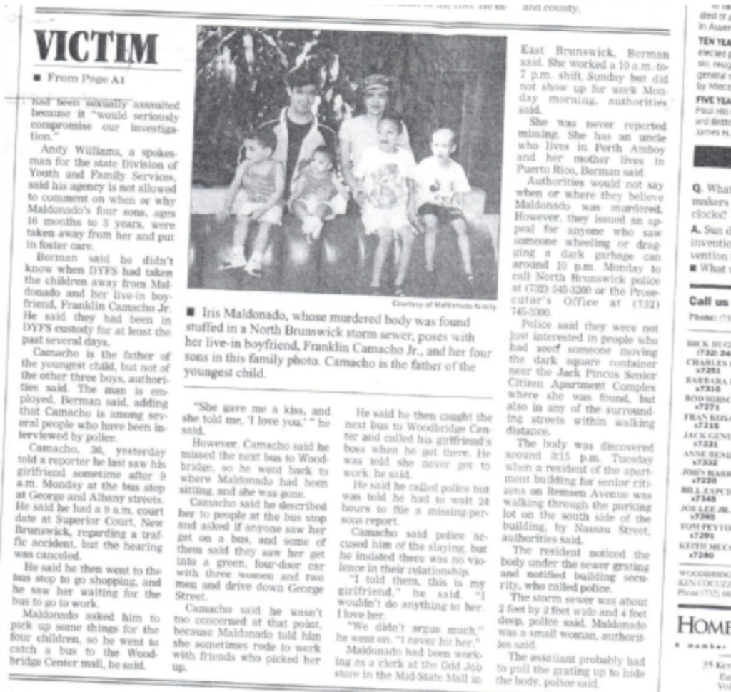 A man who lived in the apartment below the Maldonado’s residence recalls Iris and her 30 year old live-in boyfriend, Frank Camacho, having a major fight in February of the same year and then again on Sunday, July 25, after Iris was seen by coworkers leaving her job at “Odd Job Trading” on Route 18 in East Brunswick at 7:00 p.m. The next day, Frank Camacho told authorities he last saw her at a bus stop at George and Albany Streets in downtown New Brunswick, heading to her job for a 5:00 p.m. shift. Frank claims he saw her as he was taking a different bus to Woodbridge Center to get something for the children. He was supposed to meet Iris back at the bus stop that night but when he arrived at 10 p.m. she was not there. At first, Frank thought Iris went to visit her uncle in Perth Amboy but he began to worry when he found out that Iris didn’t even make it to work that day.