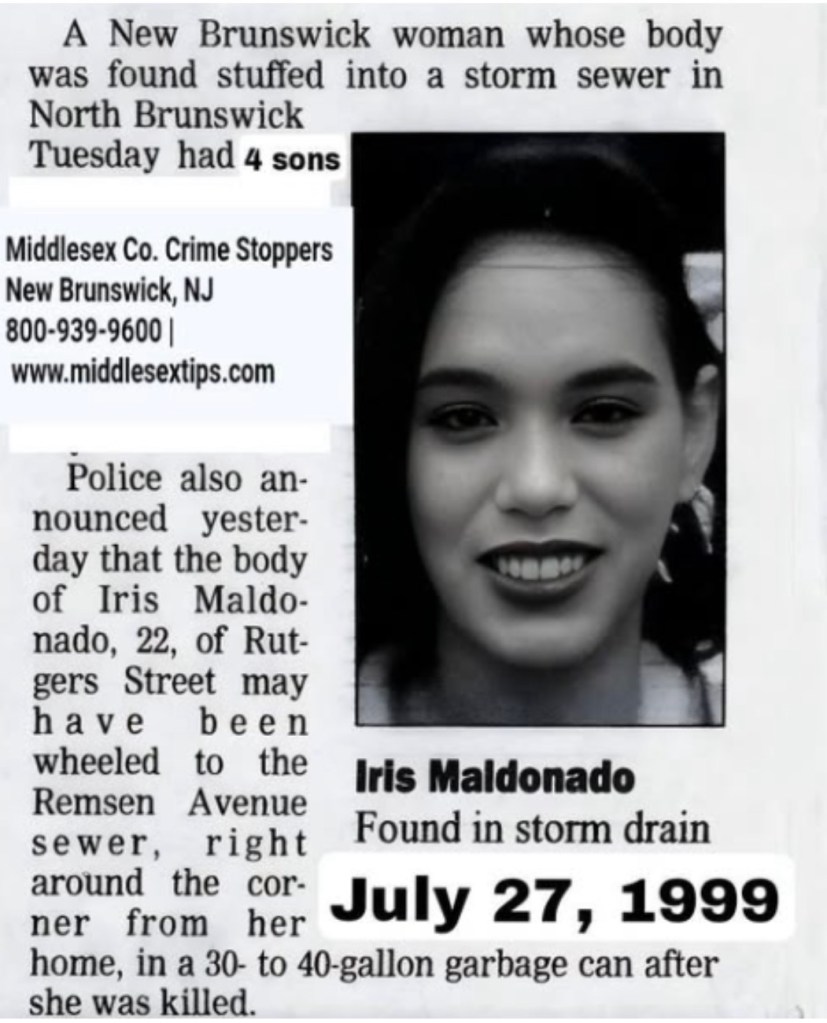 On July 27, 1999, 22 year old mother of four, Iris Maldonado’s body was found stuffed inside of a storm drain at the “Jack Pincus Senior Citizens Apartment Complex” on Remsen Avenue and Nassau Street in North Brunswick, New Jersey. She had been stabbed multiple times. It is presumed that on the night of July 26th, Iris was killed and her body had been carted about 6 blocks from her house in a large 30 – 40 gallon dark colored trash can with wheels to the storm drain. It is unknown how this was figured out. Nearby neighbors did not recall seeing anyone hauling a trashcan when questioned by authorities.