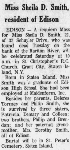 Sheila D. Smith was 22 years old when she was reported missing by her mother after she was last seen leaving her home at 37 Schuyler Drive on February 4, 1973 in Edison, New Jersey. She had been missing for over two weeks before her body was located along the edge of the north embankment of the Raritan River in Edison on Tuesday, February 20 at 4:00 p.m. This place is about one mile from her home. She was fully clothed and sprawled face down over a large rock near Player Avenue and the Raritan Boat Club. The north embankment is 12 feet high.