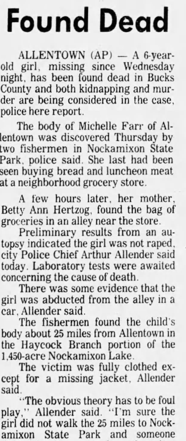 On Wednesday, March 6, 1980 at 11:30 a.m., the body of little 6 year old Michelle Farr was located by fishermen in Lake Nockamixon Pennsylvania, after being kidnapped from Allentown, Pennsylvania. She was found fully clothed minus her jacket, floating in the northeast section of the lake, close to the intersection of Route 563 and 412 in Bucks County. An autopsy concluded that Michelle died from suffocation or strangulation.