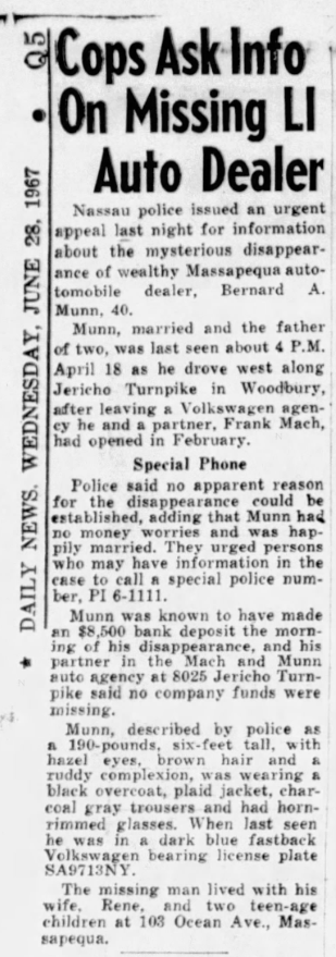 40 year old Bernard Arthur Munn was last seen on April 18, 1967 as he was driving west on the Jericho Turnpike in Woodbury, Nassau County New York at 4:00 p.m. He had left the Volkswagen agency he and a partner had opened in February that same year. He was in a 1967 dark blue Volkswagen with NY plates #SA9713. He never went home to his wife and kids, and has never been heard from again.