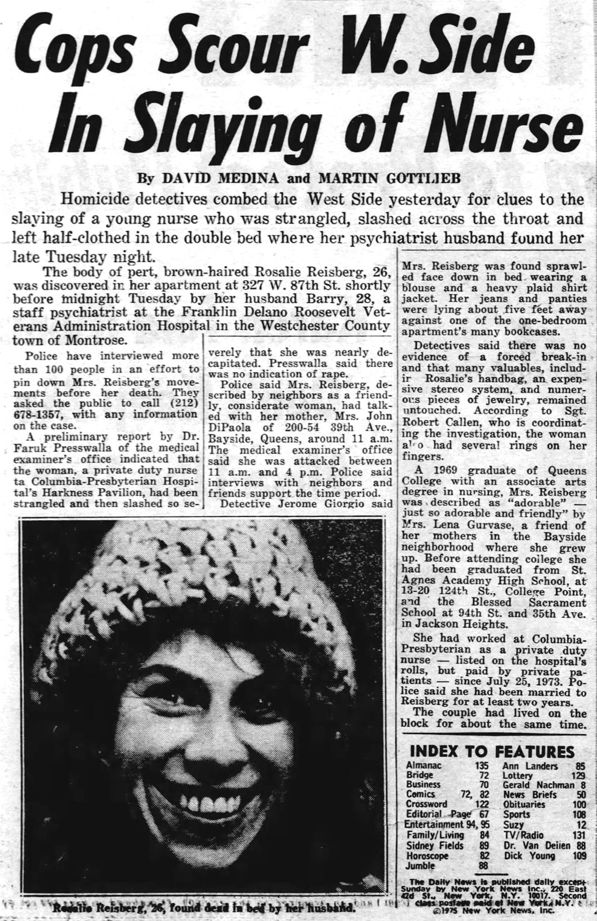 In October 1975, 26 year old New York City nurse Rosalie DiPaola Reisberg was found brutally murdered in her West 87th Street apartment, a peaceful spot just steps from Riverside Drive. Discovered by her husband late that night, Rosalie was partially unclothed, her throat slashed, yet nothing was stolen and no signs of forced entry or sexual assault were found, leaving detectives baffled. Investigators believe she was killed sometime between 11 a.m., after speaking with her mother, and the early afternoon when she was expected at work and a scheduled hair appointment she never made. With no clear motive, no definitive timeline, and no solid leads, more than 30 detectives canvassed the neighborhood, reinterviewed witnesses, spoke with merchants, and retraced every step of her final hours. Despite their efforts, the case remains unsolved, leaving a haunting mystery on a quiet Manhattan block and a family without answers.