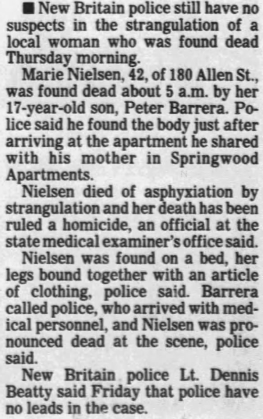 On June 18, 1987, 17 year old Peter Barrera entered his New Britain, Connecticut apartment through a window, having earlier given his mother his key after she locked hers in her car, and made a heartbreaking discovery. Inside, he found his mother, Marie Techlowec Nielsen, lying face-down on her bedroom bed. Her legs were bound with clothing, and investigators later determined that she had died from asphyxia due to strangulation.