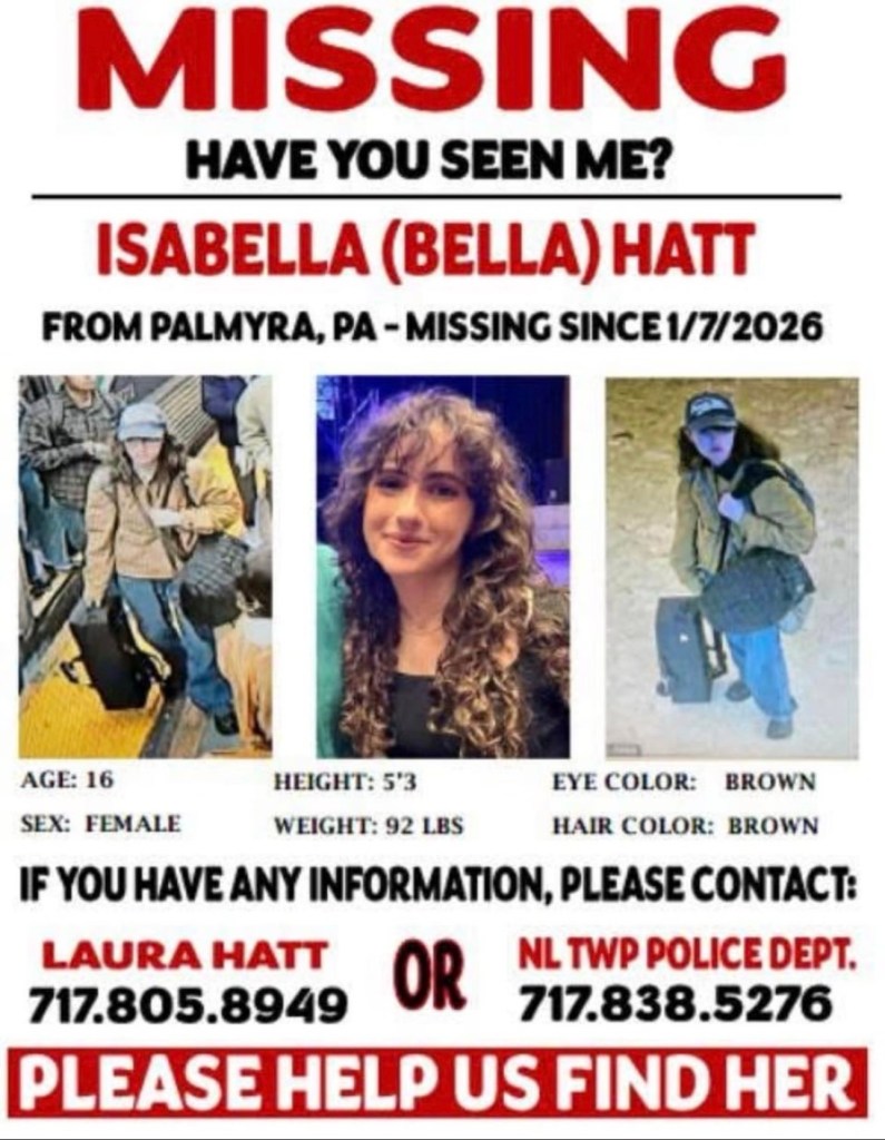 Police in Lebanon County Pennsylvania are asking for the public’s help in locating teenager Isabella “Bella” Hatt, who has been missing since January 1st of 2026. Bella left her home in Palmyra, PA, and traveled to New York City, where surveillance footage confirmed her arrival at Penn Station on January 8th at around 8:00 a.m. She was last seen at a shelter in New York, and there have been no updates or new leads, according to her mother. Tragically, Bella missed her 17th birthday while missing. She is described as 5’3”, weighing about 92 pounds, with brown curly hair and brown eyes.