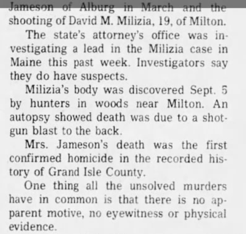 David Mark Milizia was a 19 year old whose life was tragically cut short in early September 1976. He was last seen alive on the night of September 4, and the following day his body was discovered in a wooded area off Watkins Road in the Town of Milton, Vermont. Authorities determined that David was the victim of a homicide, having suffered from a shotgun blast to the back. Evidence indicates that more than one individual may have been involved in his death. Nearly five decades later, his case remains unsolved and under the jurisdiction of the Vermont State Police Major Crime Unit, leaving unanswered questions and a continued search for justice.