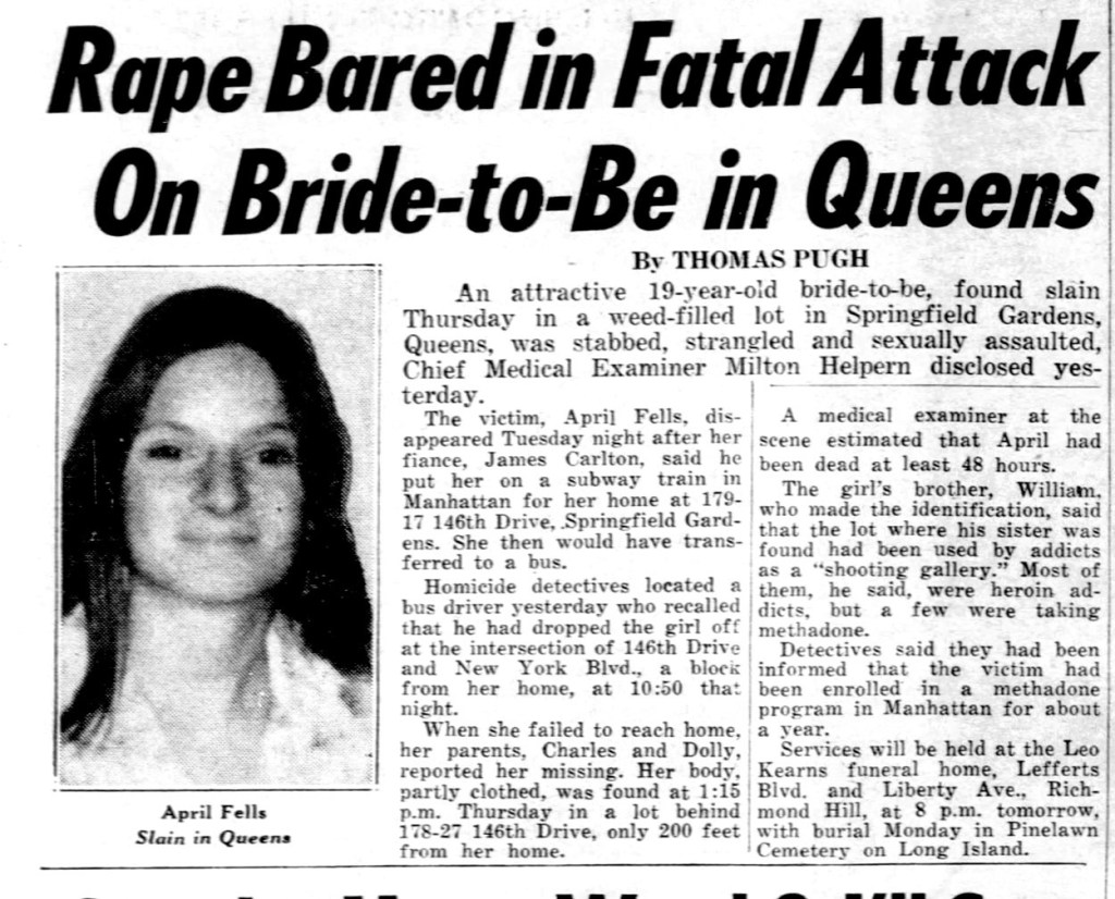 On November 8, 1973, 19 year old April Fells was found murdered in a vacant lot behind 178-27 146th Drive in Springfield Gardens, Queens, New York. She lived nearby at 179-17 146th Drive and had been returning home from Manhattan on the night of November 6 after visiting her fiancƩ. According to police, her fiancƩ, Gerald Parish, last saw her around 8:15 p.m. when she entered the BMT subway at Union Square. She traveled to Parsons Boulevard in Jamaica, Queens, then boarded a bus. The bus driver recalled dropping her off at the intersection of 146th Drive and New York Boulevard (Guy R. Brewer Boulevard) at approximately 10:50 p.m., just a few hundred yards from her home. She never made it to her front door.