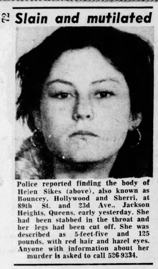 Helen Sikes, a 19 year old runaway from California, disappeared from Times Square, New York, in January 1979. Days later, her body was discovered on January 14 at 89th Street and 23rd Avenue in Jackson Heights, Queens. She had been stabbed in the throat and her legs had been severed and placed a block away.